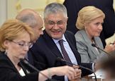 Министр внутренних дел России Владимир Колокольцев (слева) и заместитель председателя правительства России Ольга Голодец (справа) во время заседания президиума Государственного совета, посвященного реализации государственной антинаркотической политики. Заседание прошло в резиденции Ново-Огарево.