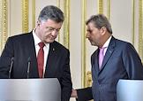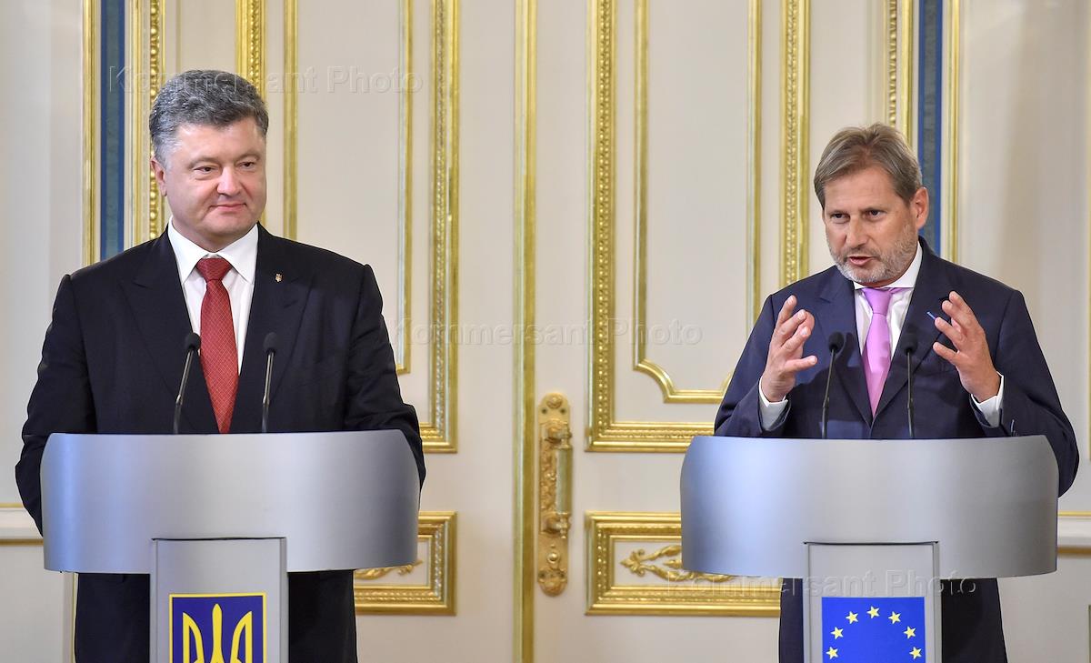 Президент Украины Петр Порошенко (слева) и Европейский комиссар по вопросам расширения и политики добрососедства Йоханнес Хан (справа) во время встречи.