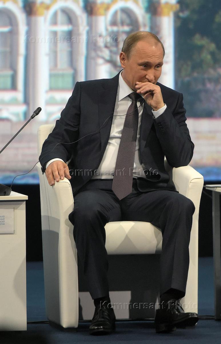 XIX Петербургский международный экономический форум (ПМЭФ) 2015 прошел на территории выставочного комплекса "Ленэкспо". Президент России Владимир Путин на пленарной сессии ПМЭФ.