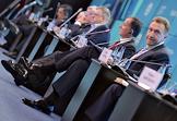 XIX Петербургский международный экономический форум (ПМЭФ) 2015 прошел на территории выставочного комплекса "Ленэкспо". Президент, председатель правления, заместитель председателя совета директоров ОАО "НК "Роснефть" Игорь Сечин (в центре) на пленарной сессии ПМЭФ.