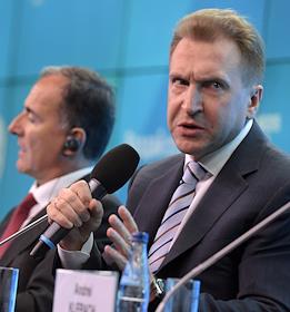 XIX Петербургский международный экономический форум (ПМЭФ) 2015 прошел на территории выставочного комплекса "Ленэкспо". Первый заместитель председателя правительства России Игорь Шувалов (справа) на пленарной сессии ПМЭФ.