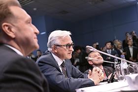 XIX Петербургский международный экономический форум (ПМЭФ) 2015 прошел на территории выставочного комплекса "Ленэкспо". Президент Российского союза промышленников и предпринимателей (РСПП) Александр Шохин (в центре) на презентации результатов национального рейтинга состояния инвестиционного климата в субъектах Российской Федерации.
