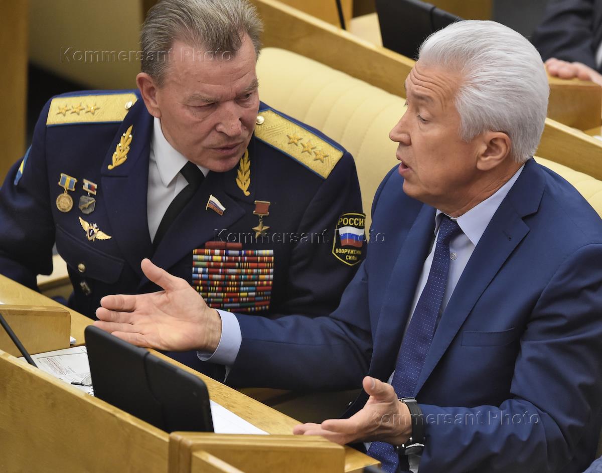 Председатель Комитета Государственной думы (ГД) России по конституционному законодательству и государственному строительству Владимир Плигин (справа) во время пленарного думского заседания.