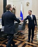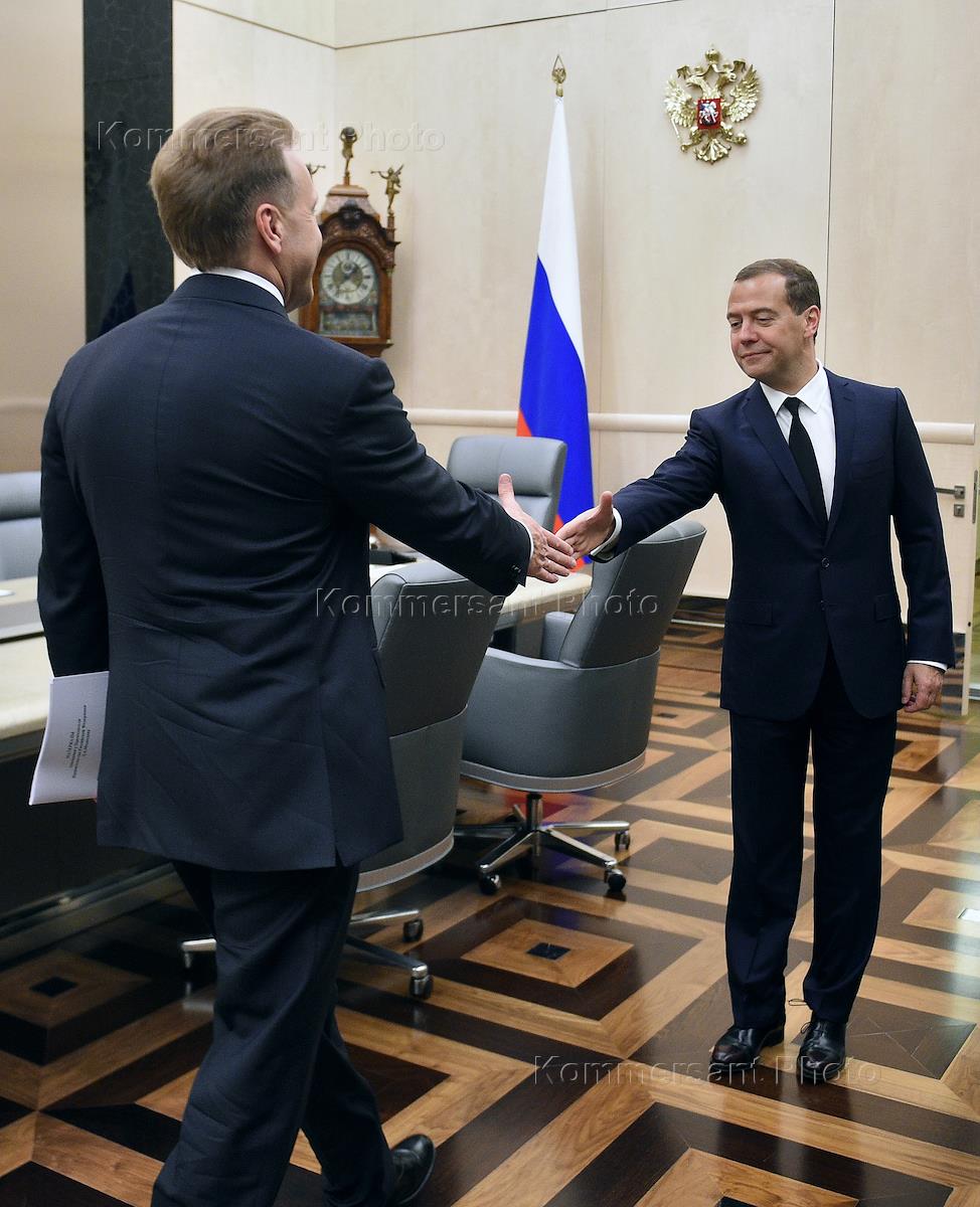 Председатель правительства России Дмитрий Медведев (справа) и его первый заместитель Игорь Шувалов (слева) на совещении в Доме правительства России.