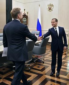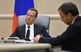 Председатель правительства России Дмитрий Медведев (слева) на совещении со своими заместителями в Доме правительства России.