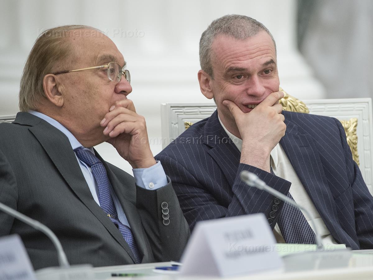 Директор Центра педагогического мастерства Иван Ященко (слева) и ректор Европейского университету в Санкт-Петербурге Олег Харходин (справа) перед началом заседания Совета при президенте России по науке и образованию на тему "Новые вызовы и приоритеты развития науки и технологий в Российской Федерации". Заседание прошло в Екатериненском зале Сенатского дворца Кремля.