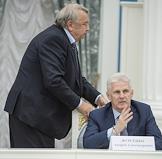 Президент Российской академии наук (РАН) Владимир Фортов (слева) и помощник президента России Андрей Фурсенко (справа) перед началом заседания Совета при президенте России по науке и образованию на тему "Новые вызовы и приоритеты развития науки и технологий в Российской Федерации". Заседание прошло в Екатериненском зале Сенатского дворца Кремля.