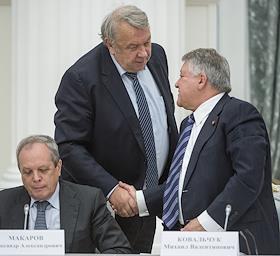 Слева направо: директор Института молекулярной биологии имени В.А.Энгельгардта РАН, академик РАН Александр Макаров, президент Российской академии наук (РАН) Владимир Фортов и директор Российского научного центр "Курчатовский институт" Михаил Ковальчук перед началом заседания Совета при президенте России по науке и образованию на тему "Новые вызовы и приоритеты развития науки и технологий в Российской Федерации". Заседание прошло в Екатериненском зале Сенатского дворца Кремля.