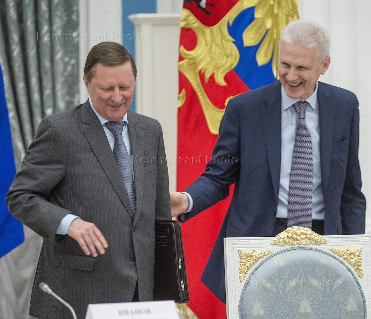 Руководитель администрации президента России Сергей Иванов (слева) и президент Российской академии наук (РАН) Владимир Фортов (справа) перед началом заседания Совета при президенте России по науке и образованию на тему "Новые вызовы и приоритеты развития науки и технологий в Российской Федерации". Заседание прошло в Екатериненском зале Сенатского дворца Кремля.