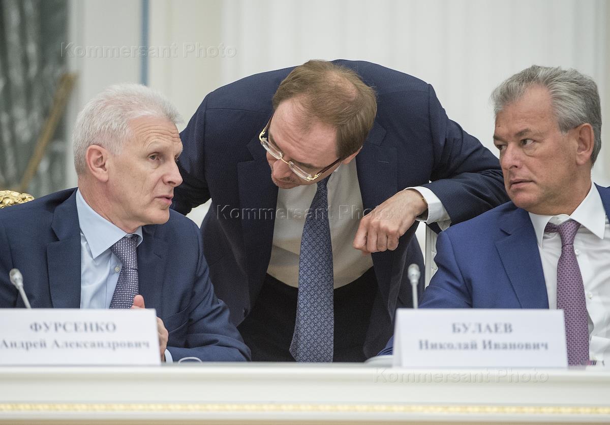 Слева направо: помощник президента России Андрей Фурсенко, ректор Санкт-Петербургского университета Николай Кропачев и член комитета Государственной думы (ГД) России по Регламенту и организации работы ГД России Николай Булаев перед началом заседания Совета при президенте России по науке и образованию на тему "Новые вызовы и приоритеты развития науки и технологий в Российской Федерации". Заседание прошло в Екатериненском зале Сенатского дворца Кремля.