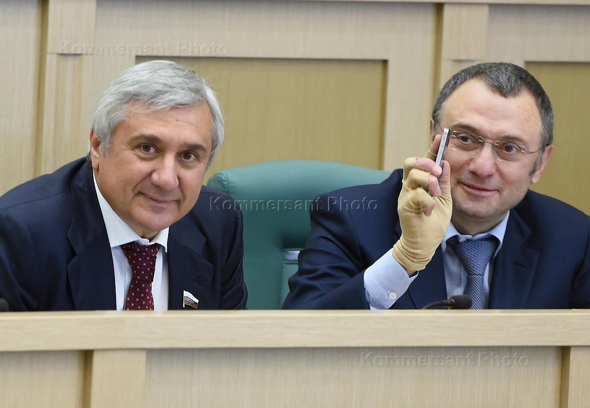 Представитель в Совете Федерации (СФ) России от законодательного (представительного) органа государственной власти Республики Ингушетия Ахмед Паланкоев (слева) и представитель в Совете Федерации (СФ) России от законодательного (представительного) органа государственной власти Республики Дагестан Сулейман Керимов (справа) во время заседания СФ.