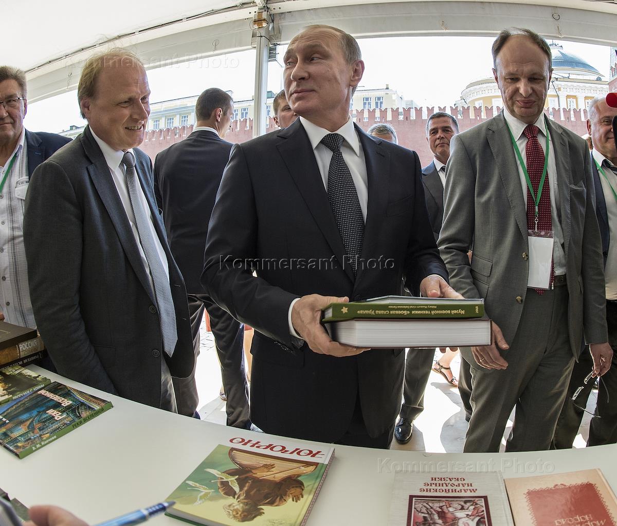 Фестиваль "Книги России". Слева направо: советник Президента России по культуре Владимир Толстой, президент России Владимир Путин, руководитель Федерального агентства по печати и массовым коммуникациям (ФАПМК) России Михаил Сеславинский во время фестиваля на Красной площади.