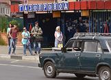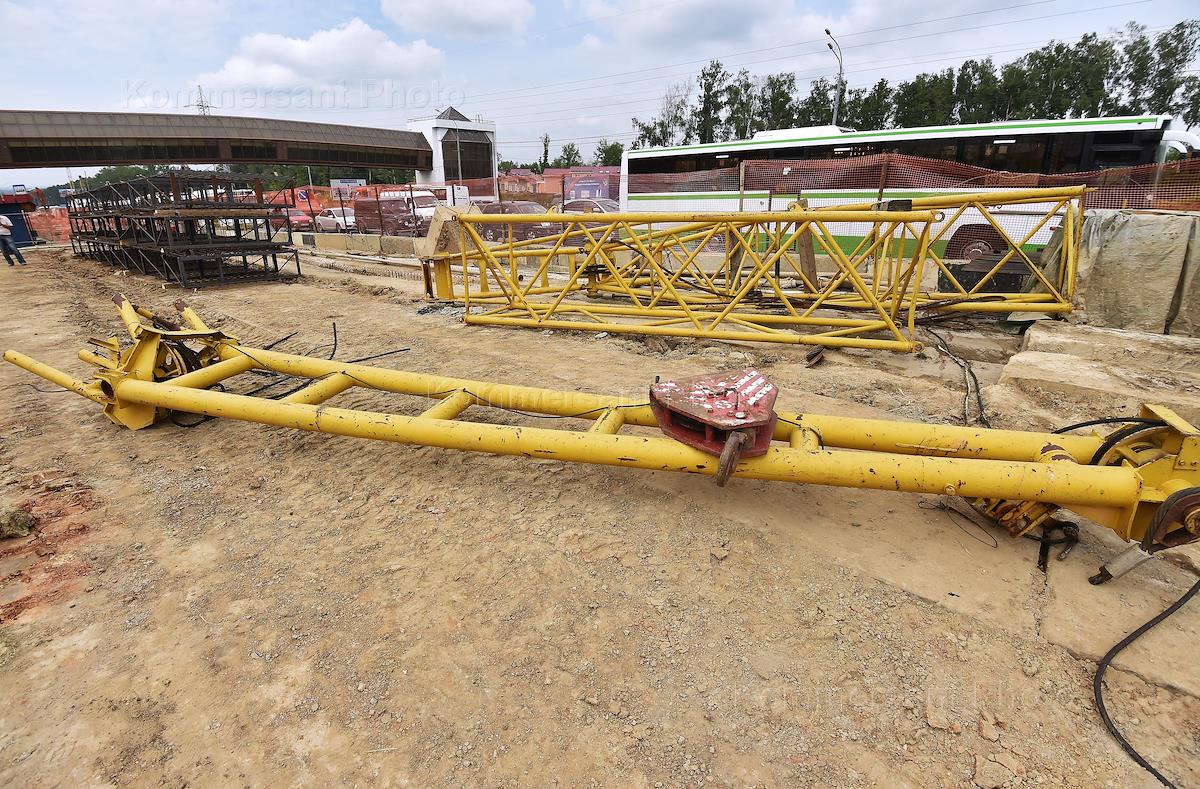 Происшествие на Калужского шоссе в Новой Москве. На шоссе в районе поселка Газопровод рухнул строительный кран. В результате происшествия пострадал один человек, несколько автомобилей были повреждены, движение на Калужского шоссе полностью перекрыто. Пассажиры на автобусной остановке.