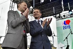 Московский международный книжный фестиваль "Книги России". Руководитель Федерального агентства по печати и массовым коммуникациям (ФАПМК) России Михаил Сеславинский (слева), председатель Государственной думы России Сергей Нарышкин (справа) во время фестиваля на Красной площади.