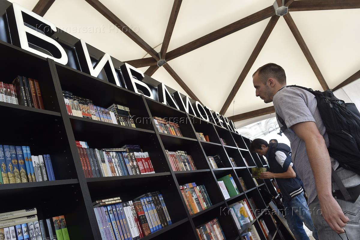 Московский международный книжный фестиваль "Книги России" прошел на Красной площади. Посетители фестиваля у стенда "Библиотека.
