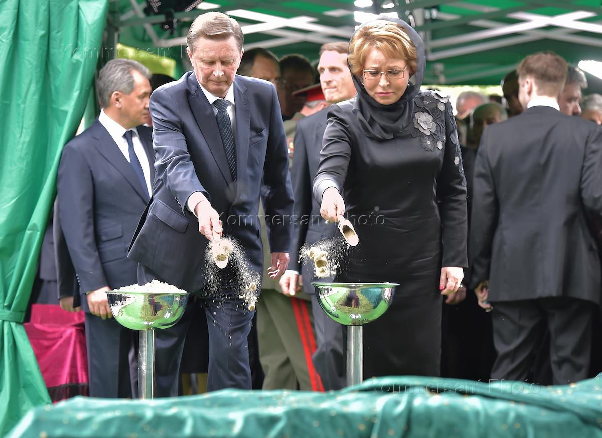 Похороны политика Евгения Примакова на Новодевичьем кладбище. Слева направо: дочь Евгения Примакова Нана, председатель Государственной думы России Сергей Нарышкин, председатель Совета Федерации России Валентина Матвиенко, патриарх Московский и всея Руси Кирилл, президент России Владимир Путин и вдова Евгения Примакова Ирина во время похорон.