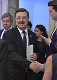 Председатель комитета Совета федерации по международным делам Константин Косачев перед началом заседания Российского общественного совета по международному сторудничеству и публичной дипломатии. Заседание прошло в Общественной палате России.