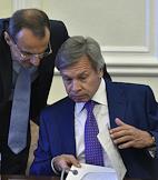 Председатель комитета Государственной думы России по международным делам Алексей Пушков (слева) и председатель комитета Совета федерации по международным делам Константин Косачев (справа) во время заседания Российского общественного совета по международному сторудничеству и публичной дипломатии. Заседание прошло в Общественной палате России.
