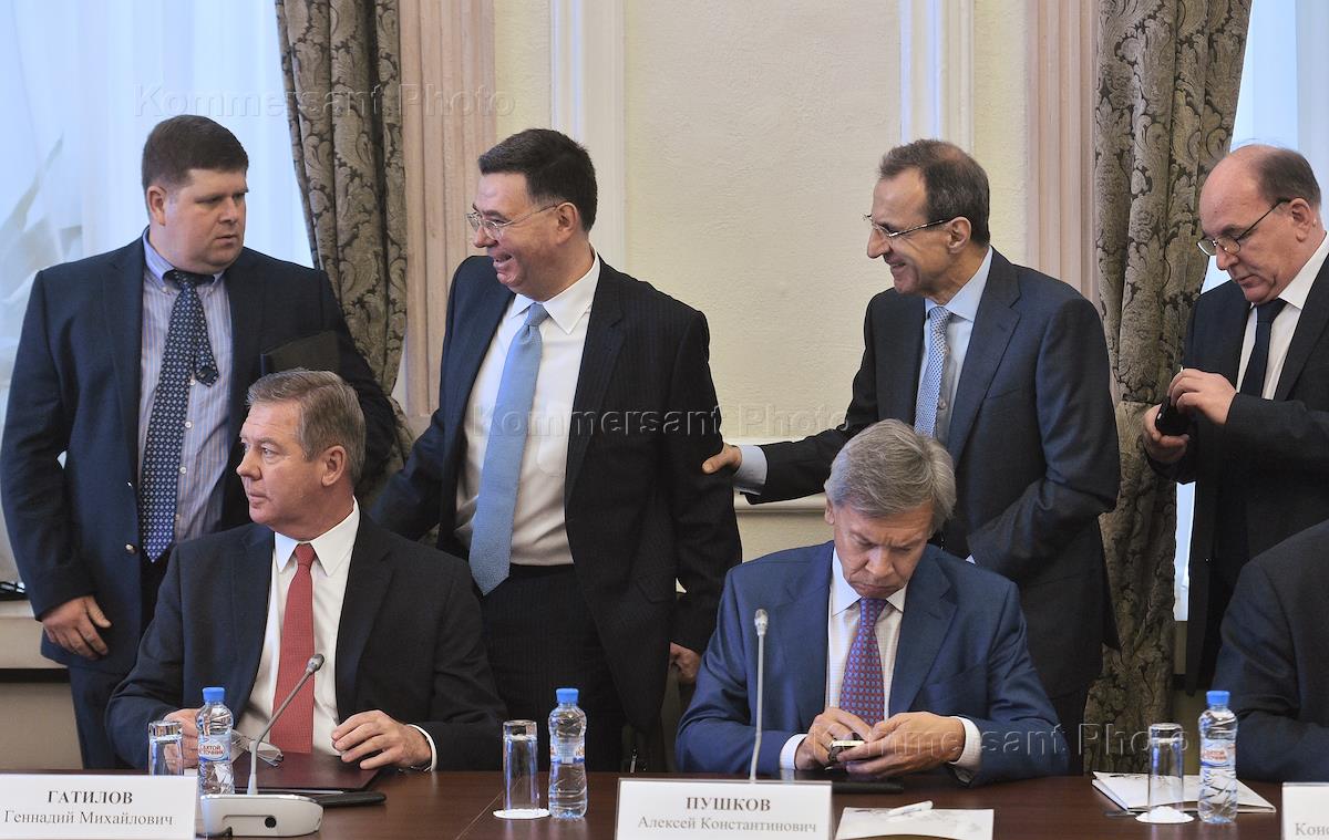 Заместитель министра иностранных дел России Геннадий Гатилов (второй слева), директор Департамента международных организаций МИД России Александр Панкин (третий слева), председатель комитета Государственной думы России по международным делам Алексей Пушков (третий справа) и член Общественной палаты России, председатель Российского общественного совета по международному сотрудничеству и публичной дипломатии Сергей Орджоникидзе (второй справа) перед началом заседания Российского общественного совета по международному сторудничеству и публичной дипломатии. Заседание прошло в Общественной палате России.