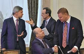 Слева направо: председатель комитета Государственной думы (ГД) России по международным делам Алексей Пушков, член комитета ГД по делам Содружества Независимых Государств, евразийской интеграции и связям с соотечественниками Василий Лихачев, член Общественной палаты России, председатель Российского общественного совета по международному сотрудничеству и публичной дипломатии Сергей Орджоникидзе и заместитель председателя Российской ассоциации содействия ООН, заведующий кафедрой ЮНЕСКО Московского государственного института международных отношений (Университета) МИД России Алексей Борисов перед началом заседания Российского общественного совета по международному сторудничеству и публичной дипломатии. Заседание прошло в Общественной палате России.