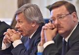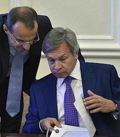 Председатель комитета Государственной думы России по международным делам Алексей Пушков (слева) и председатель комитета Совета федерации по международным делам Константин Косачев (справа) во время заседания Российского общественного совета по международному сторудничеству и публичной дипломатии. Заседание прошло в Общественной палате России.