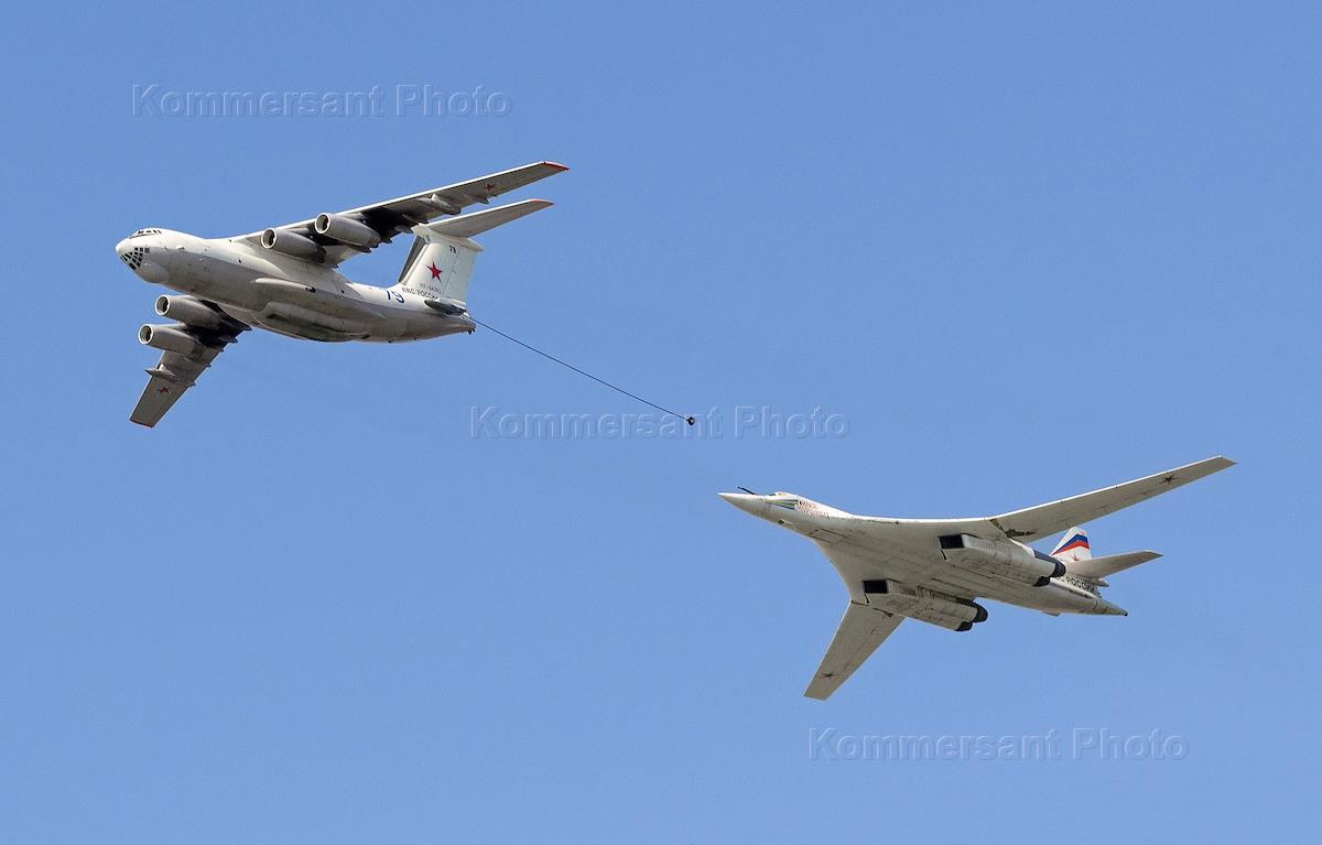 Жанровая фотография. Самолет-заправщик Ил-78 (по кодификации НАТО: Midas) выполняет дозаправку в воздухе сверхзвукового стратегического бомбардировщика-ракетоносца Ту-160 "Белый лебедь" (по кодификации НАТО: Blackjack — "Блэкджек").