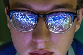 Жанровая фотография. Отражение графиков биржевых котировок в очках мужчины.