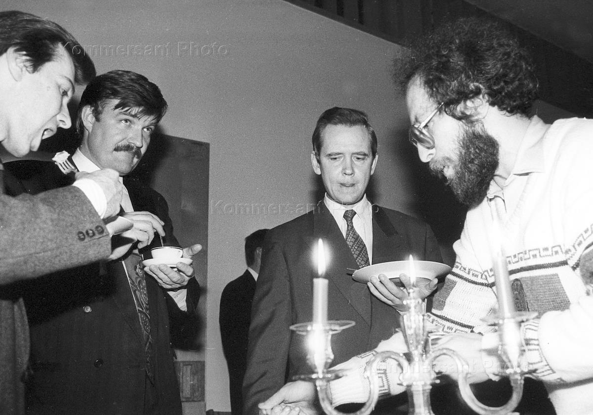 TV journalist Vladislav Flyarkovsky (left), Eugeny Kiselev (second left), Alexei Venediktov (right) and Russian President's Adviser Sergei Stankevich (second right) take part in a reception at an embassy.