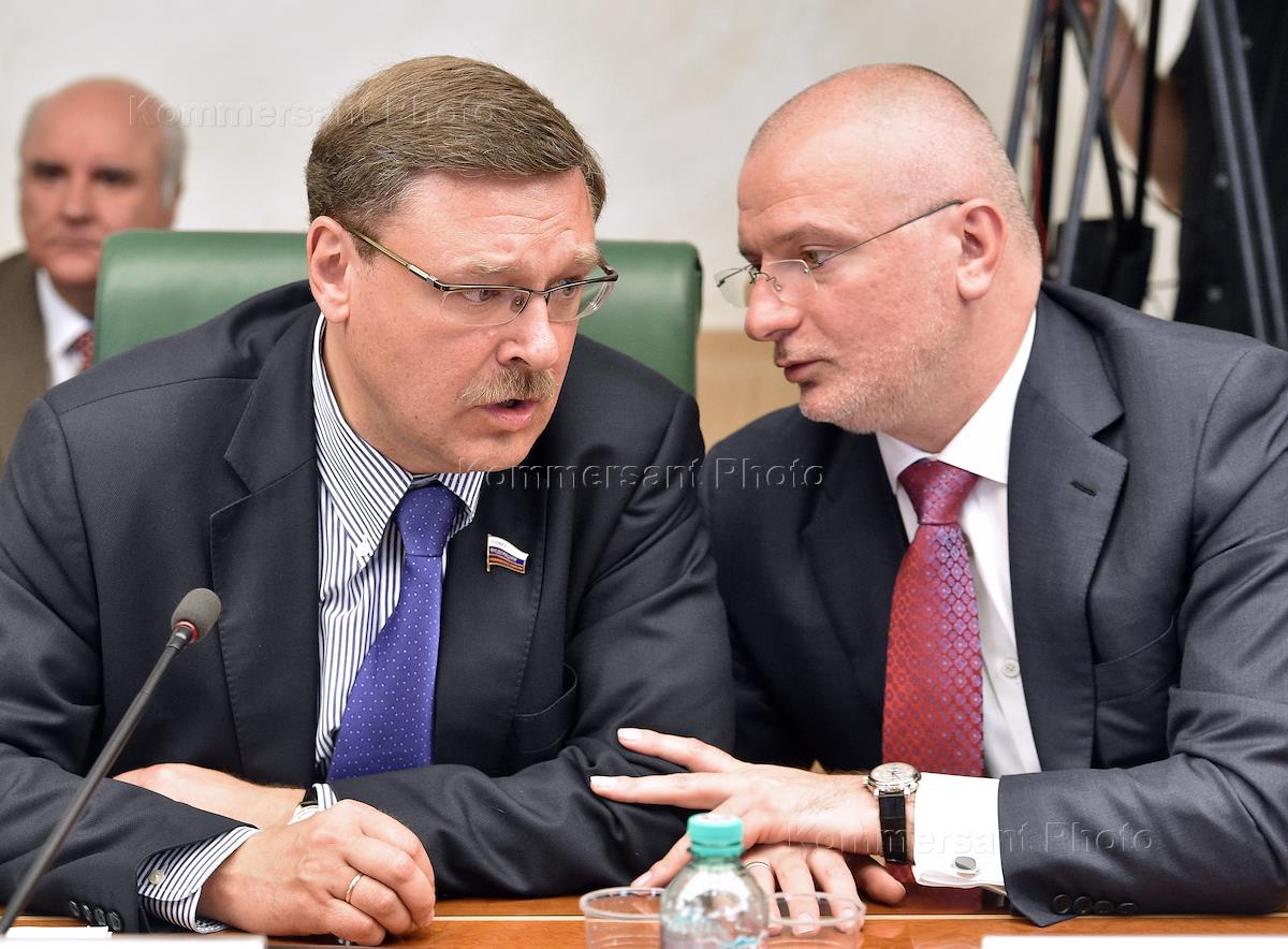 Председатель комитета Совета Федерации (СФ) России по международным делам Константин Косачев (слева) и председатель комитета СФ по конституционному законодательству, правовым и судебным вопросам, развитию гражданского общества Андрей Клишас (справа) во время совещания о подготовке заявления "О дополнительных мерах по противодействию антироссийской активности иностранных и международных неправительственных организаций". Совещание прошло в Совете Федерации России.