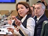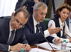 Заместитель председателя комитета Государственной думы России по делам общественных объединений и религиозных организаций Александр Тарнавский (справа) и руководитель Центра международной журналистики и исследований информагентства "Россия сегодня" Вероника Крашенинникова (слева) во время совещания о подготовке заявления "О дополнительных мерах по противодействию антироссийской активности иностранных и международных неправительственных организаций". Совещание прошло в Совете Федерации России.