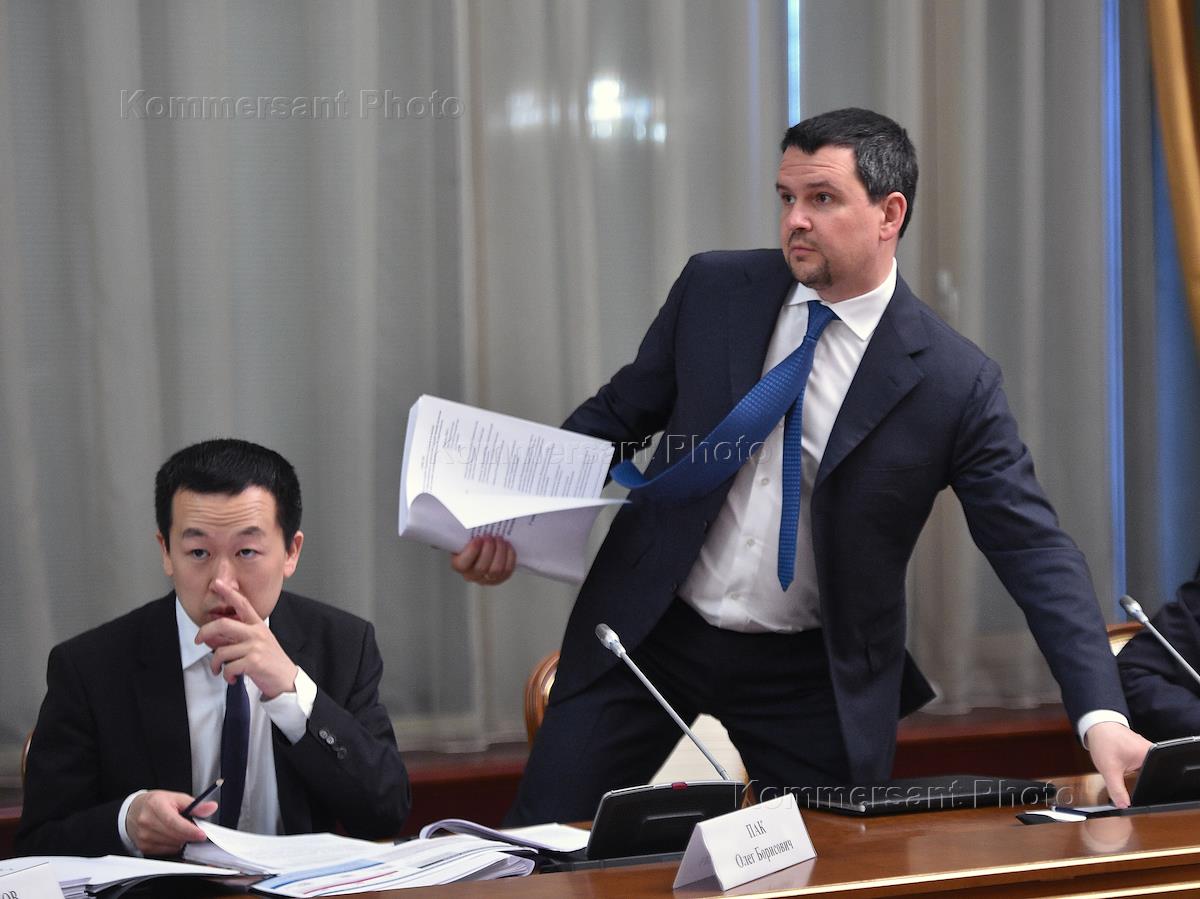Статс-секретарь - заместитель министра связи и массовых коммуникаций России Олег Пак (слева) и первый заместитель руководителя аппарата правительства России Максим Акимов (справа) перед началом заседания Правительственной комиссии по использованию информационных технологий для улучшения качества жизни и условий ведения предпринимательской деятельности. Заседание прошло в Доме правительства России.