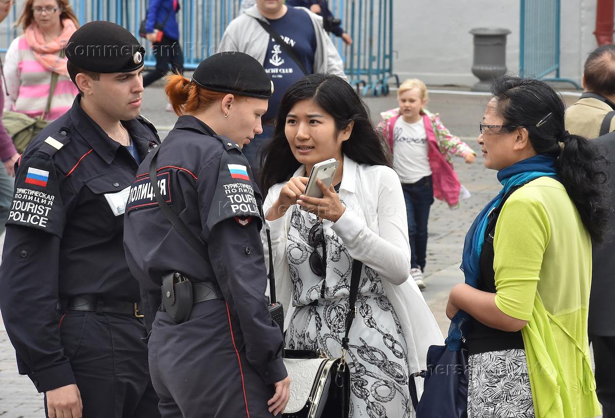 Жанровая фотография. Гости столицы во время общения с сотрудниками туристической полиции на улице города.