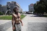 Жанровая фотография. Мужчина с голым торсом на улице города.