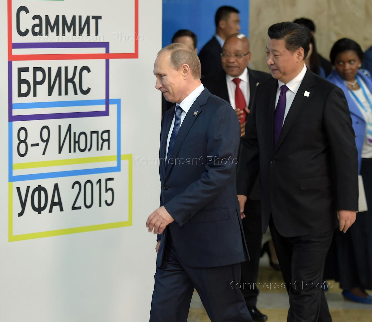 VII саммит БРИКС. Слева направо: президент России Владимир Путин, президент Южно-Африканской Республики Джейкоб Зума и председатель Китайской Народной Республики Си Цзиньпин после церемонии приветствия лидеров БРИКС.