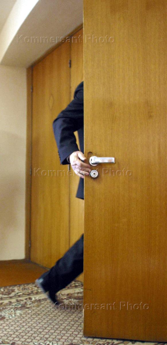 A policeman guards the entrance into the Leningrad Oblast legislature.