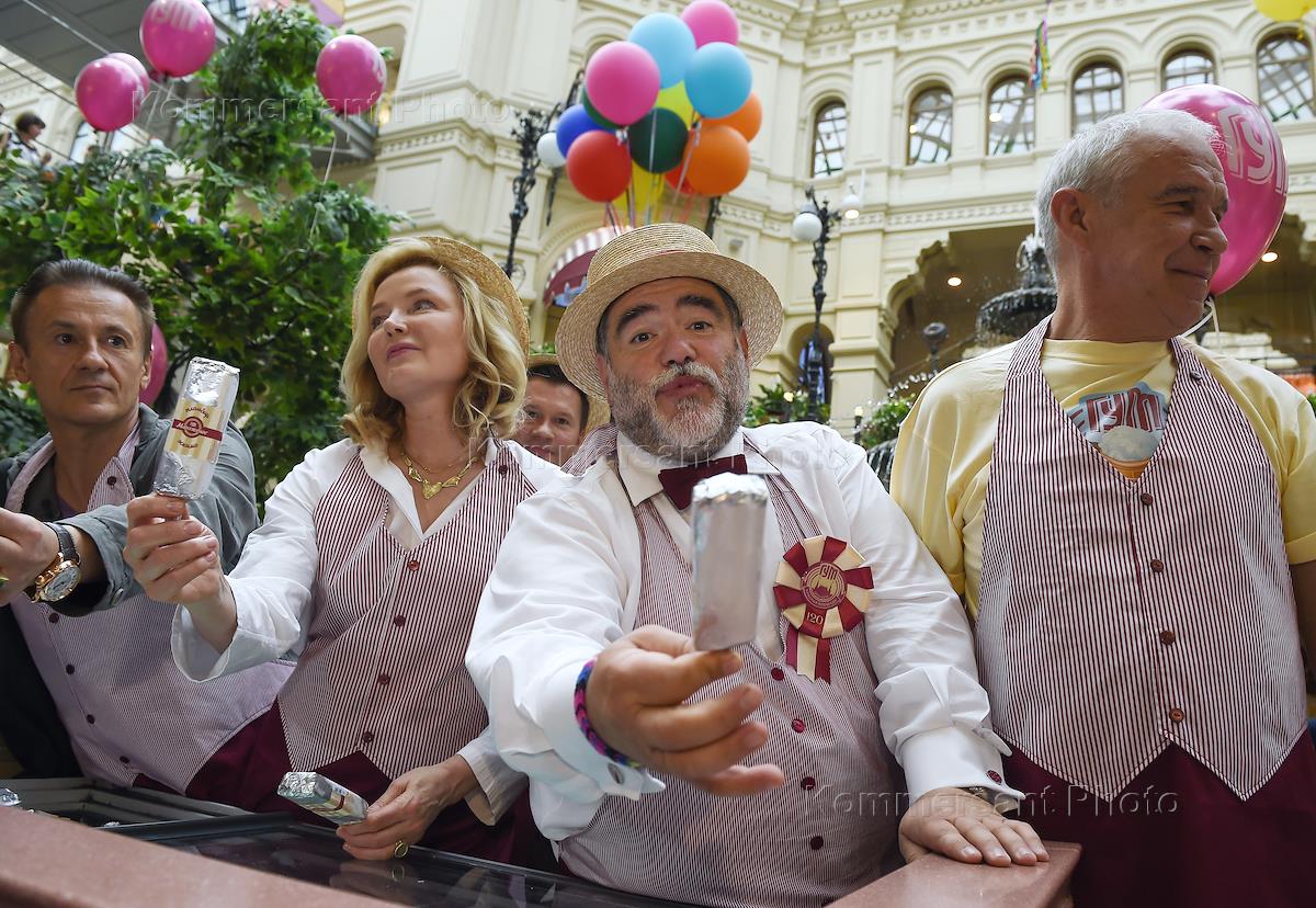 Телеведущий Леонид Парфенов (в центре) на празднике мороженого в московском ГУМе.