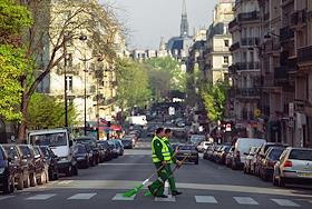 Жанровая фотография. Виды Парижа. Дворники переходят улицу по переходу.