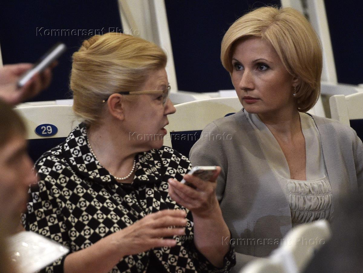 II съезд общероссийской общественной организации защиты семьи "Родительское всероссийское сопротивление". Председатель комитета Государственной думы (ГД) России по вопросам семьи, женщин и детей Елена Мизулина (слева) и председатель комитета ГД по труду, социальной политике и делам ветеранов Ольга Баталина (справа) на съезде в Концертном зале им. Чайковского.