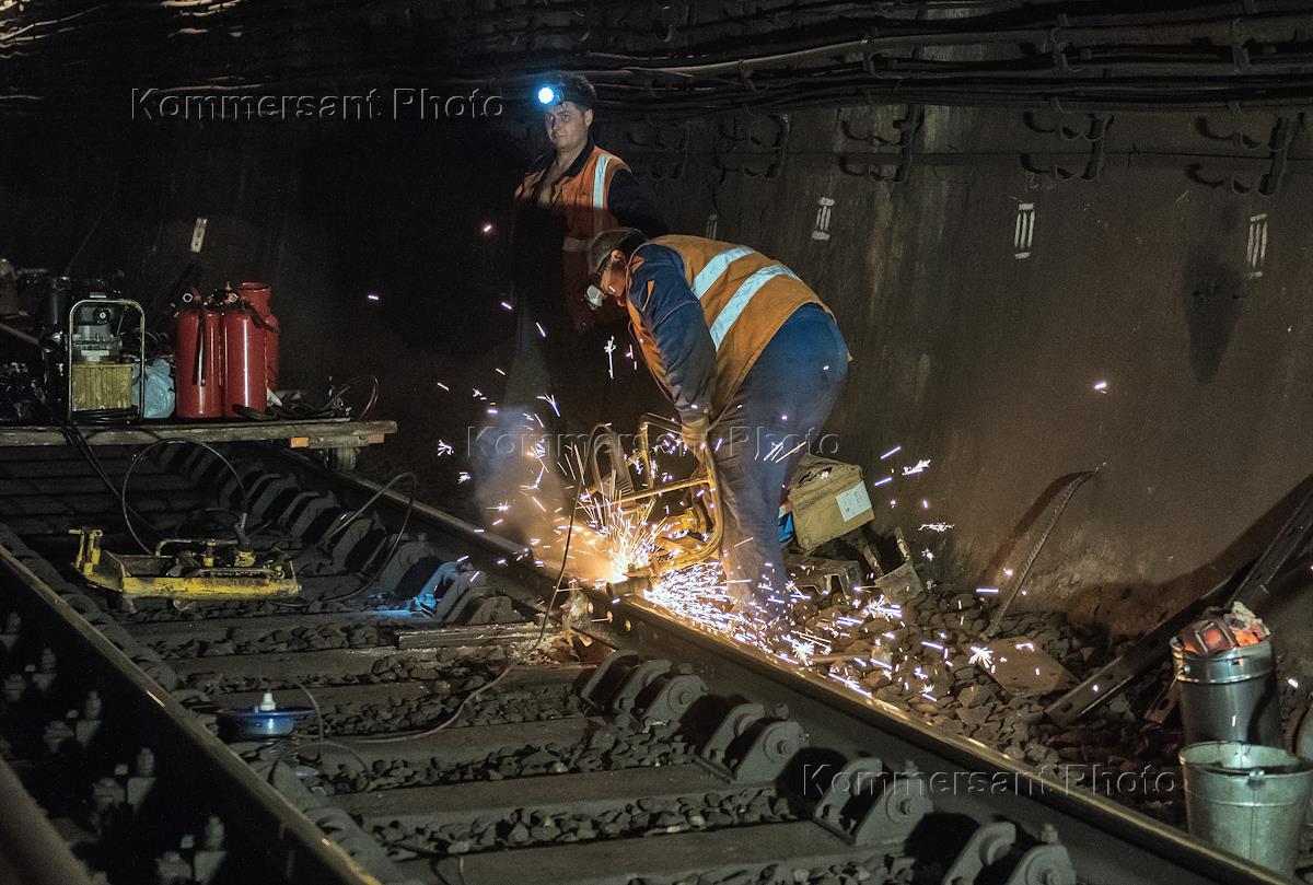 Рабочие во время ремонтных работ на закрытом участке Сокольнической линии Московского метрополитена.