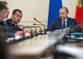 Председатель правительства России Дмитрий Медведев (слева) и президент России Владимир Путин (справа) во время совещания с членами правительства России в резиденции Ново-Огарево.