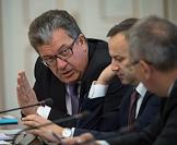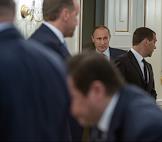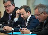 Слева направо: заместитель председателя правительства России - руководитель аппарата правительства России Сергей Приходько, заместитель председателя правительства России Аркадий Дворкович, заместитель председателя Правительства России Дмитрий Рогозин во время совещания президента России Владимира Путина с членами правительства России в резиденции Ново-Огарево.