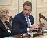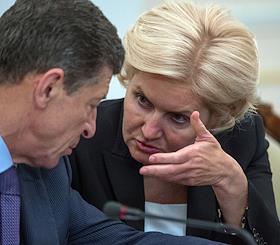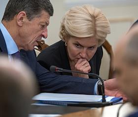 Заместитель председателя правительства России Дмитрий Козак (слева) и заместитель председателя правительства России Ольга Голодец (справа) во время совещания президента России Владимира Путина с членами правительства России в резиденции Ново-Огарево.