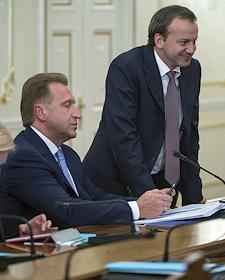 Заместитель председателя правительства России - руководитель аппарата правительства России Сергей Приходько (слева) и заместитель председателя правительства России Аркадий Дворкович (справа) на совещании президента России Владимира Путина с членами правительства России в резиденции Ново-Огарево.