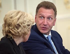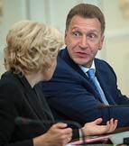 Заместитель председателя правительства России Ольга Голодец (слева) и первый заместитель председателя правительства России Игорь Шувалов (справа) во время совещания президента России Владимира Путина с членами правительства России в резиденции Ново-Огарево.