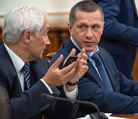 Помощник президента Роccии Андрей Белоусов (слева) и заместитель председателя правительства России - полномочный представитель президента России в Дальневосточном Федеральном округе Юрий Трутнев (мправа) во время совещания президента России Владимира Путина с членами правительства России в резиденции Ново-Огарево.