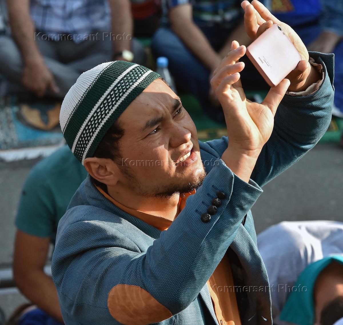 Moslems are celebrating Eid al-Fitr feast on one of the streets by Moscow Mosque-cathedral.