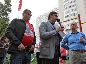 Руководитель фракции КПРФ в Московкской горородской думе Андрей Клычков (слева) и первый заместитель председателя комитета Государственной думы России по делам национальностей, первый секретарь МГК КПРФ Валерий Рашкин (в центре) во время встречи с жителями района Кузьминки Юго-восточного административного округа Москвы.