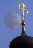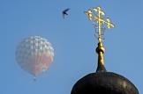 Жанровая фотография. Фестиваль воздухоплавания. Аэростат в небе. Купол церкви. Крест.