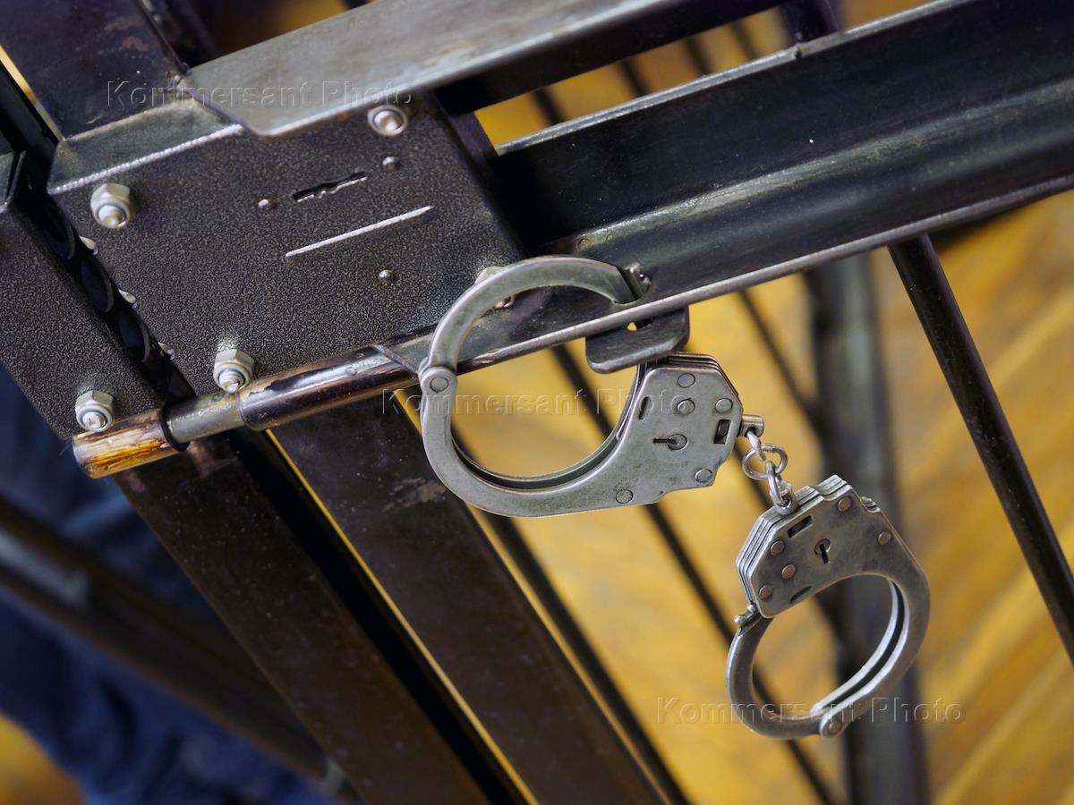 Жанровая фотография. Наручники на решетке скамьи подсудимых в зале заседаний суда.