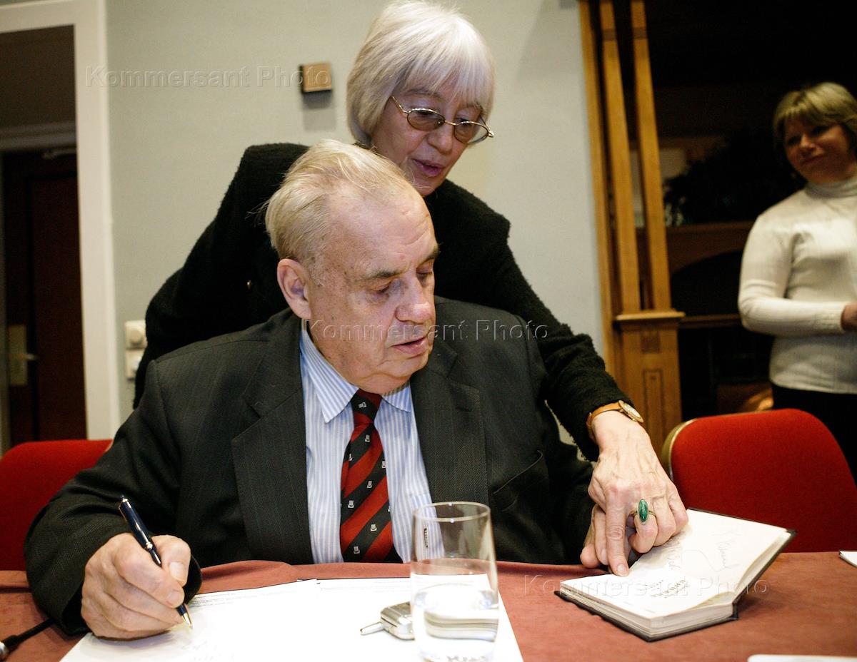 Режиссер Эльдар Рязанов рядом со своим бронзовым бюстом, установленым на Аллее славы Гуманитарного университета профсоюзов.